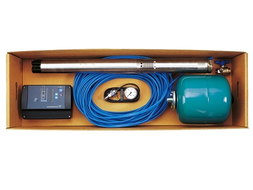Ensemble de pompe submersible SQE 2-70, réservoir sous pression, capteurs et unité de commande. H=87m, Q=3,4 m3/h, alimentation 230V. Plus d'informations
