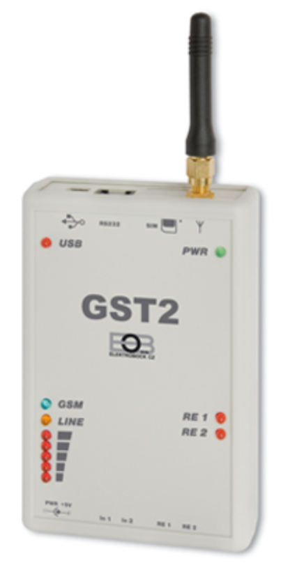 Le module GSM à distance GST2 comprend 2 entrées analogiques (choix ON/OFF ou mesure de température), 2 sorties (3A/250V) avec possibilité de fonction ON/OFF, de minuterie ou de commande par appel manqué. Possibilité de connecter USB, RS232. Il inclut des LED d'indication (intensité du signal et activation du relais).