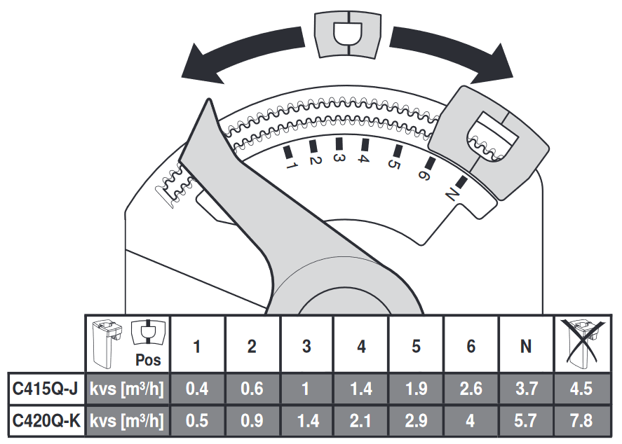 Le débit résultant peut être ajusté en fonction du degré d'ouverture de la vanne. Les étapes de réglage sont de 2,5 °. La butée finale est simplement placée dans la position souhaitée.