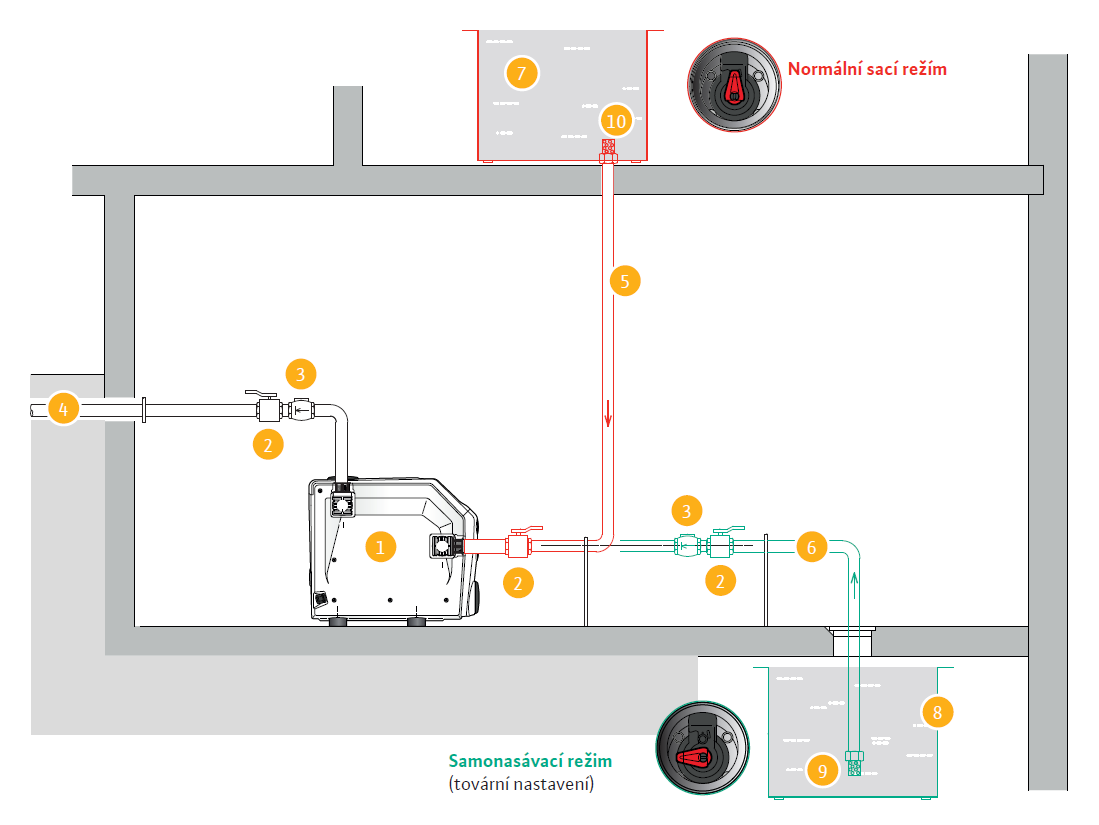 Le mode auto-amorçant (schéma vert) est activé automatiquement en usine et permet à la pompe de puiser l'eau des réservoirs, etc. Cependant, si le réservoir ou une autre source d'eau est au-dessus de l'appareil et que l'eau est acheminée vers l'appareil par gravité ou si l'appareil est connecté à un réseau de distribution sous pression, il est possible de changer le mode en tournant le bouton pour passer à l'aspiration normale (schéma rouge/noir).