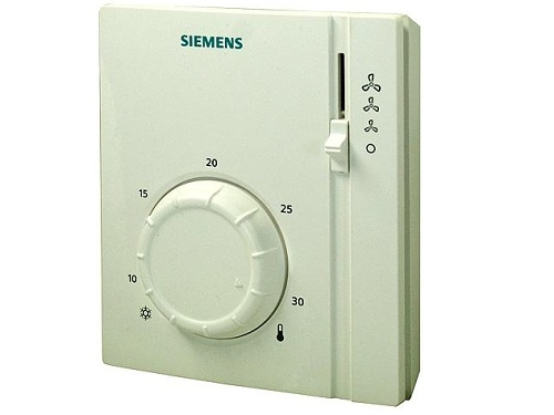 Thermostat d'ambiance pour le contrôle des unités fan-coil à deux tubes. Le thermostat RAB 21 est équipé d'un commutateur manuel chauffage/refroidissement et d'un commutateur à 3 vitesses pour le ventilateur.