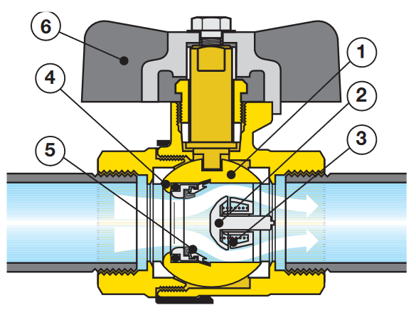 La vanne peut être ouverte ou fermée manuellement à l'aide de la poignée papillon. L'obturateur du clapet anti-retour (2) est poussé contre le ressort de fermeture (3) lors du débit, ce qui maintient la vanne ouverte et permet le passage du fluide. Lorsque la pression d'entrée tombe en dessous du niveau de la pression de sortie, l'obturateur est poussé dans la direction opposée et vient se poser sur le siège de la vanne. La vanne est alors fermée et ne permet aucun débit dans les deux sens, empêchant ainsi le reflux.